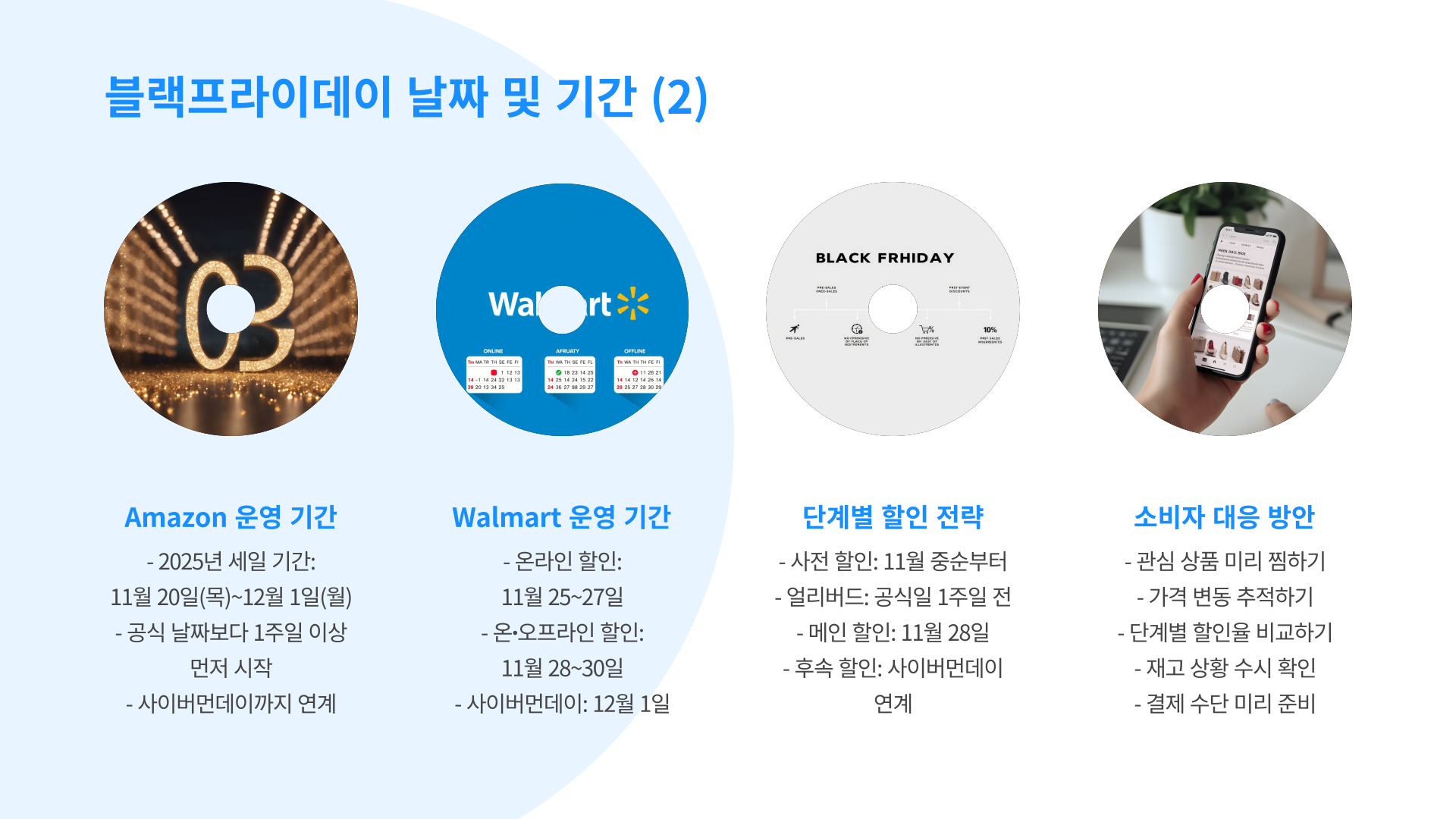2025년 블랙프라이데이는 11월 28일 금요일에 진행됩니다. 미국의 주요 리테일러인 아마존(Amazon), 월마트(Walmart), 타깃(Target) 등이 이 시기를 중심으로 대규모 할인 행사를 실시합니다. 특히 올해는 온라인 사전 세일이 더욱 확대되어, 블랙프라이데이 일주일 전부터 이미 다양한 제품들이 세일을 시작하고 있습니다.