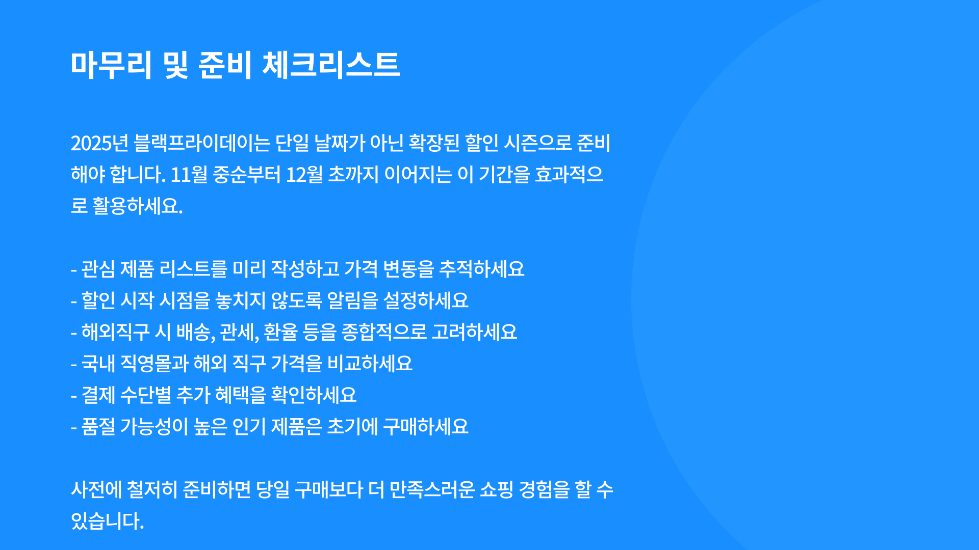 블랙프라이데이는 단순히 ‘싸게 사는 날’이 아니라, 전략적인 쇼핑이 필요한 시기입니다. 인기 제품의 재고가 빠르게 소진되고, 할인율이 매일 바뀌는 경우가 많기 때문입니다. 아래의 팁을 참고하면 실속 있게 세일을 즐길 수 있습니다.