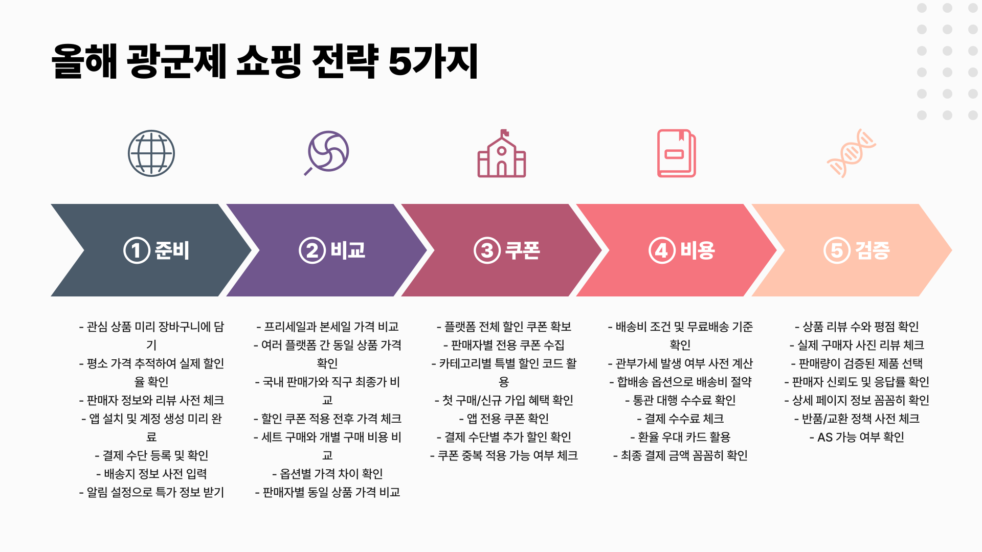 광군제는 해외 직구 비중이 매우 높기 때문에 구매 전 확인해야 할 요소들이 국내 쇼핑보다 훨씬 많습니다. 특히 배송, 통관, 반품 조건을 꼼꼼히 확인해야 하며, 해외 플랫폼 특성상 가격 변동이 자주 발생하므로 결제 직전까지 최종 금액을 재확인하는 습관이 중요합니다.